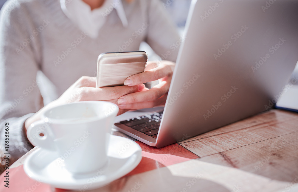 Business woman on coffee break in a cafe. Business, education, lifestyle concept