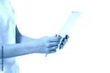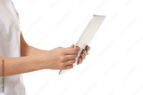 Person holding a blank tablet in both hands, isolated, PNG