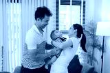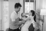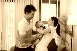A young family shares tender moments with their baby in a cozy home. The father kisses the baby tiny hand and foot while the mother holds the infant lovingly, symbolizing warmth and care.