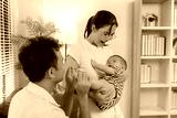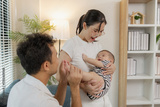 A young family shares tender moments with their baby in a cozy home. The father kisses the baby tiny hand and foot while the mother holds the infant lovingly, symbolizing warmth and care.