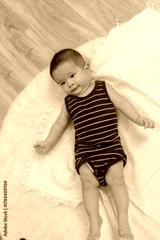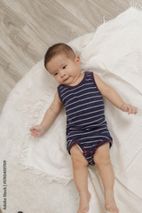 A cute baby lies comfortably on a soft white blanket, smiling warmly while wearing a striped romper. The scene conveys innocence, happiness, and the simple joy of childhood moments.