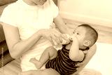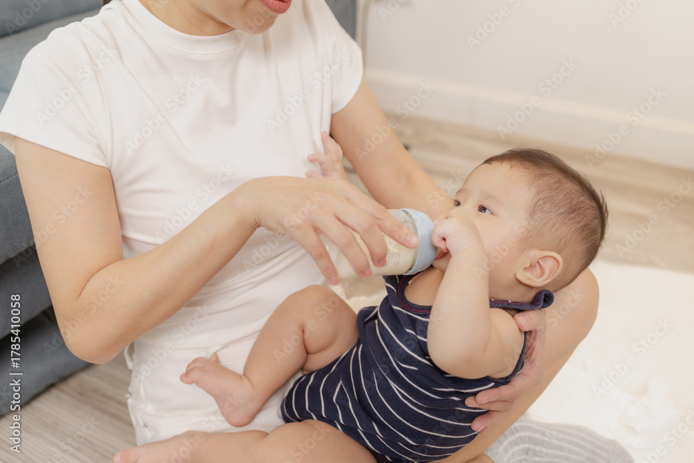 A mother is lovingly feeding her baby with a bottle of milk while holding the child in her arms. The scene highlights the warmth of parenthood, care, and maternal bonding.