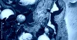 Drop flow. Color liquid. Defocused blue white purple ink water oil bubbles pigment round acrylic floating on abstract art background.