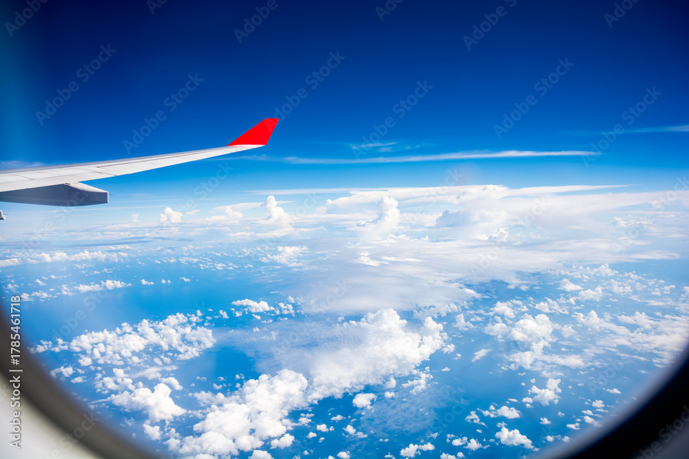 Beautiful aerial view from an airplane window. The aircraft wing with a red tip flies high above the white clouds against a deep blue sky.