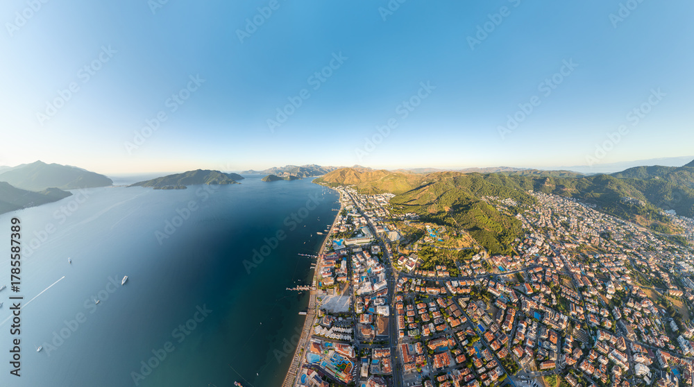 Marmaris, Turkey. Panoramic aerial view of coastline with beaches and hotels, city and forested mountains in morning sunlight. Coastal urban landscape. Aerial view.
