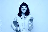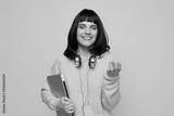 Bright portrait of a cheerful student in a yellow hoodie, holding a laptop and headphones, against a soft pink backdrop, conveying focus and creative energy.