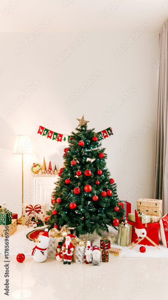 Cozy living room with a decorated Christmas tree adorned with red ornaments and a star, surrounded by wrapped gifts, a festive banner, and holiday figurines on a bright, tidy floor