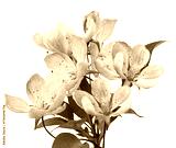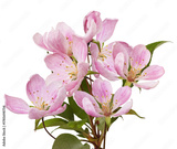 beautiful photograph of delicate pink crabapple or cherry blossoms clustered on a branch with fresh green leaves, isolated against a dark black field.
