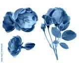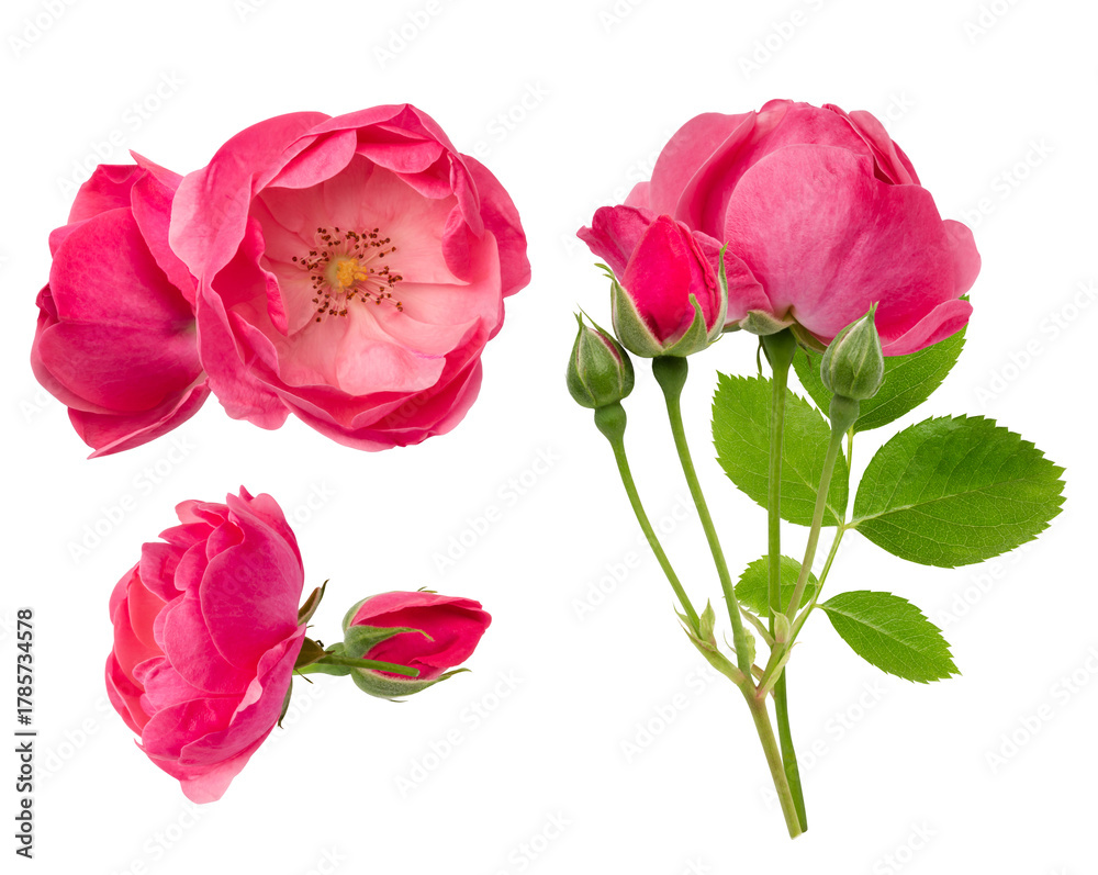 high-key photograph showcasing vivid pink wild rose flowers, including open blooms, tight buds, and a long stem with fresh green leaves, isolated sharply against a solid black backdrop.