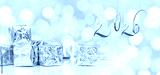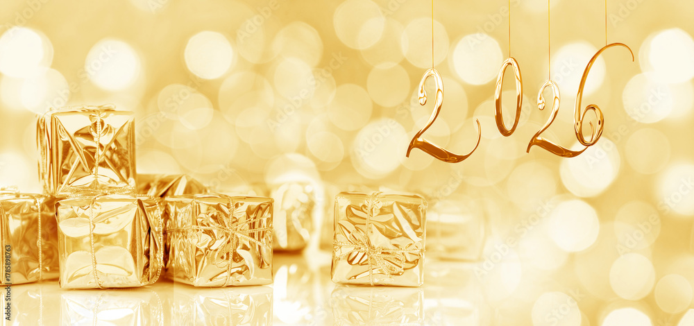 2026, new year card. Small Christmas gifts in shiny golden paper, panoramic web banner
