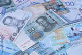 Money background, currency, paper banknotes from different countries. Money cash currency, blue