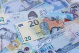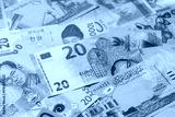 Money background, currency, paper banknotes from different countries. Money cash currency, blue
