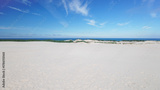 Shifting sand dunes in Łeba. Beautiful desert landscape. The Baltic Sea on the horizon. Coastal landscape. Poland. Slowinski National Park. Panorama. Summer