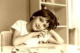 Smiling child resting at a desk with drawing supplies in a creative study space.