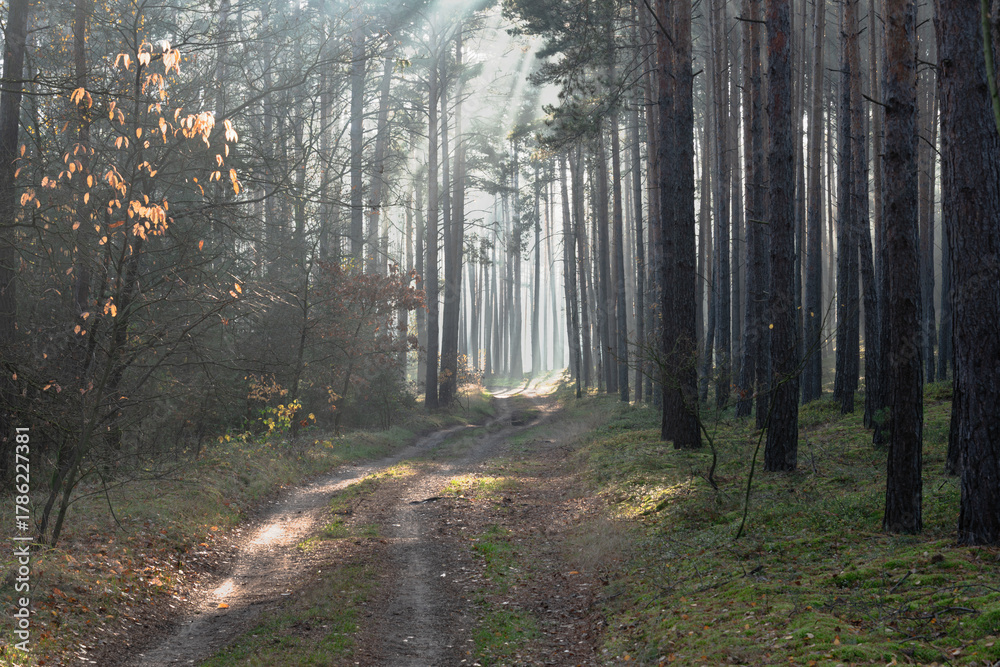 Mglisty poranek w sosnowym, wysokim lesie. Między drzewami znajduje się leśna droga. Wschodzące słońce oświetla unoszącą się nad drogą mgłę, tworząc malownicze smugi.