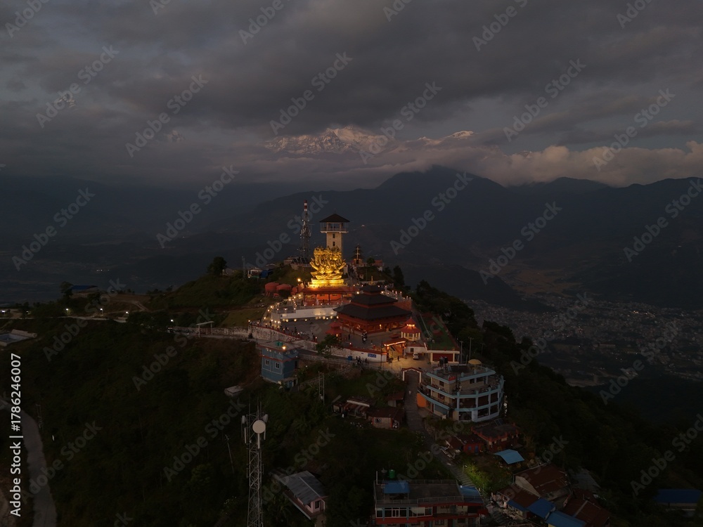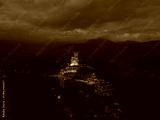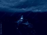 A warm-lit temple surrounded by dark storm clouds shortly before nightfall.