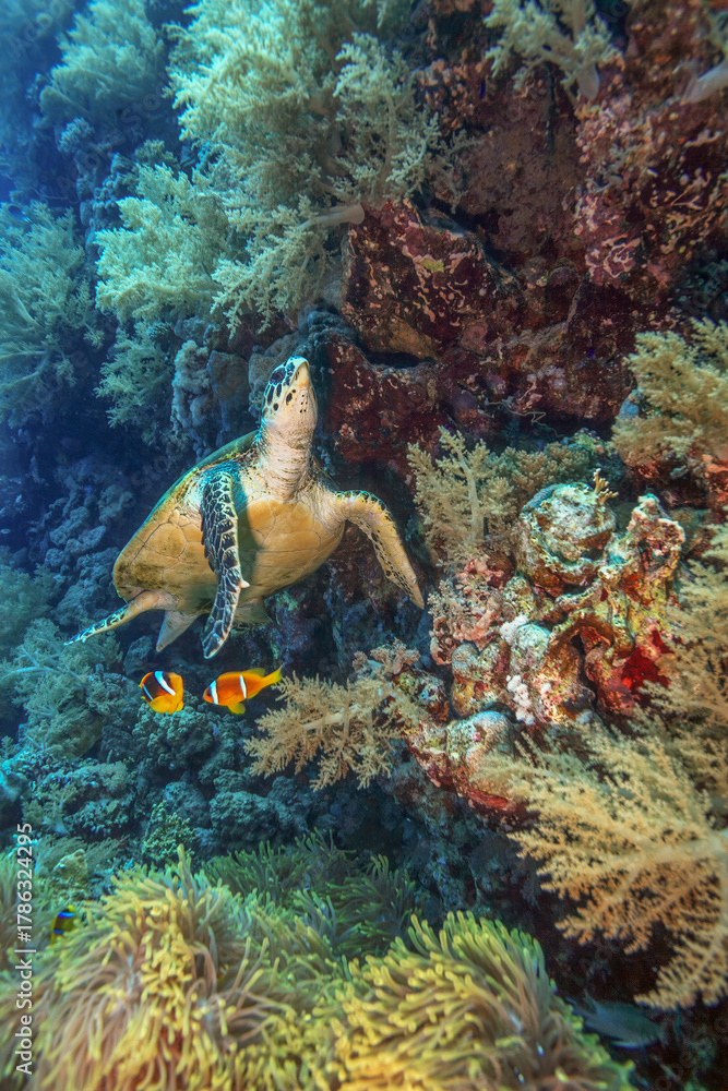 Sea turtle swimming among corals and anemones on a colorful tropical reef with clownfish in clear blue ocean water.