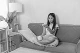Young teen watching tv, enjoying funny movie serie, relaxing home living room, holding remote control changing channels, cozy atmosphere comfort wear, drinking beverage in cup, leisure lifestyle.