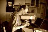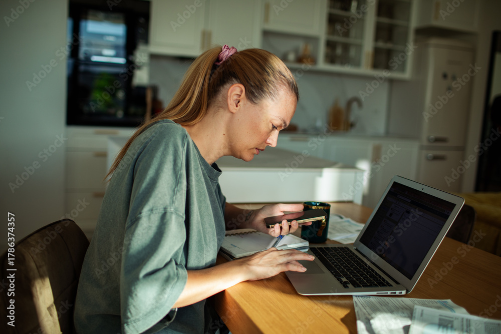 Adult woman focused on paying bills at home kitchen table