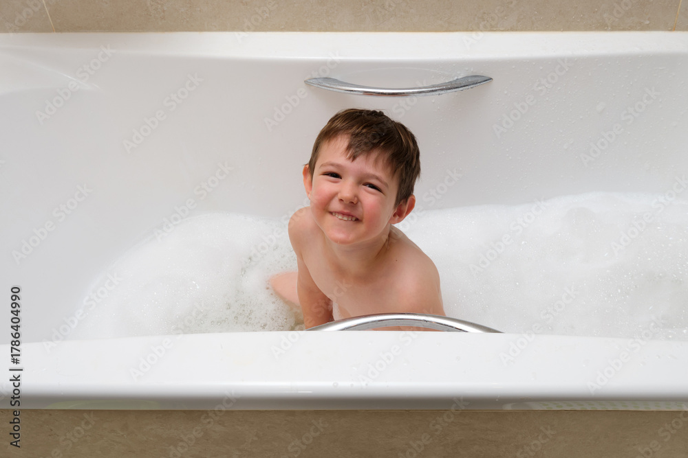 Happy young boy smiling in bubbly bathtub. Child enjoying playful bath time with white foam and suds in modern bathroom. Child aged 4 years (four years old)
