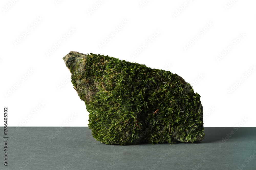 Large mossy stone isolated on white with shadow. Clean natural element ideal for eco-themed design. Copy space