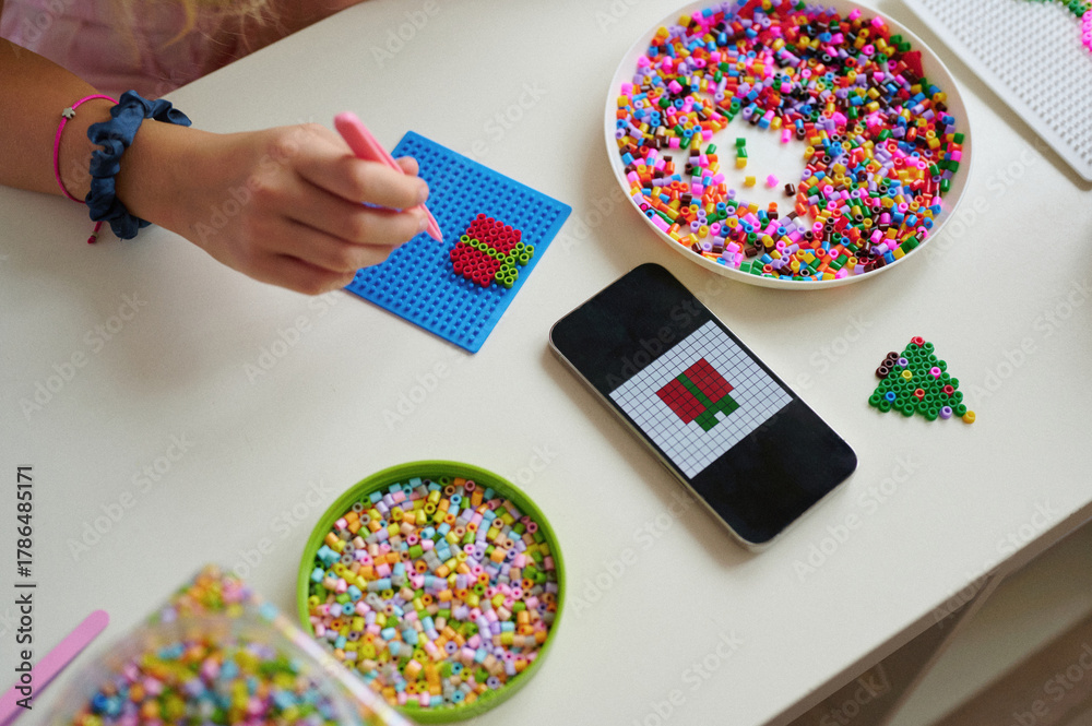 perler bead craft activity with colorful beads, smartphone app guidance, and creative design on tabletop. woman's hand placing beads on blue pegboard for vibrant art project