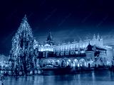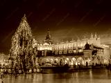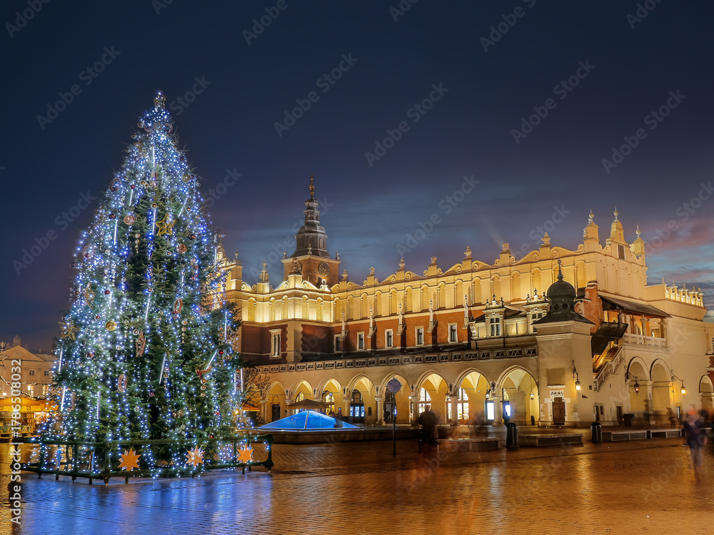 Giant christmas tree illuminated at night standing next to historical Cloth Hall on the Main Market Square in Krakow, Poland