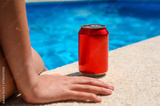 A can of drink by the pool. A girl with a drink is relaxing by the hotel pool.