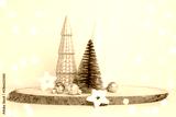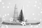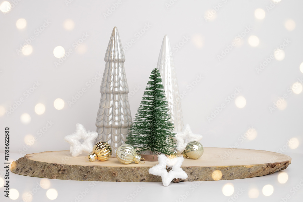 Modern Christmas trees. Decorative Beige, White and Green Christmas Decoration on a Wooden Stand with a Gray background. Nordic Festive Decor. Boho, Scandinavian Style Design. Trendy Minimal Ornament.