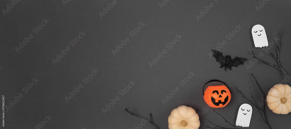 Halloween black background with bats, spiders, pumpkins and twigs. Modern Holiday design. Halloween party border on Dark Gray colour. Flat lay, top view, copy space. Thanksgiving fall decoration. 2022