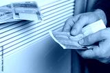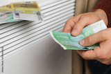 Human Hand Holding Euro Banknotes near Electric Heater Radiator at Home. Man Pay Money for Heating. Expensive to Heat Energy Saving. Rising Cost of Living. Global Gas Crisis. Paying Cold Season Bills