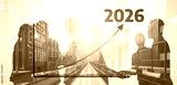 A conceptual image depicting business growth with professionals' silhouettes, a successful projection graph, and a dynamic urban landscape, showcasing future planning and innovation. Tessel