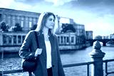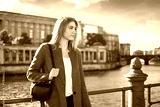 Young woman standing near the river and enjoying a beautiful view.