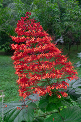 Beautiful pagoda flower, whose scientific name is Clerodendrum paniculatum. It is a pyramid-shaped shrub with orange-red flowers.