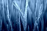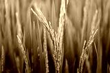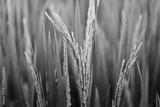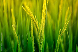 Close-up photograph of green rice panicles in a paddy field during sunrise or sunset. Perfect for agriculture themes, sustainability projects, organic farming visuals