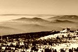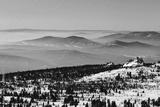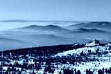 Mountain ridges in soft fog at dawn. Beautiful lilac blue Peaks fades into distance, pastel colored sky background. Minimal Nature abstract landscape, natural gradient color skyline, winter serenity.
