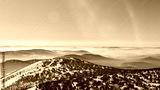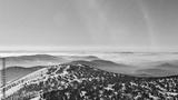 View from mount peak Mystag on Green mount, Altai mountains covered snow forest in soft blue haze, nature banner. Peaks fades in distance under clear winter blue sky, natural gradient tones.