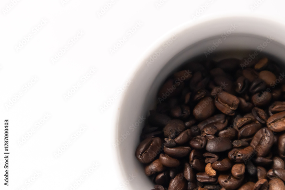 coffee beans falling out of a white cup