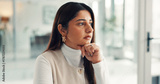 Thinking, professional and business woman in office for investment decision, brainstorming and problem solving. Idea, finance consultant and person with solution, planning and insight for proposal