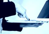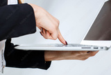 Young cheerful smiling businesswoman holds laptop in hands on white isolated background with copyspace