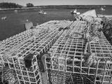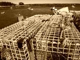 Closeup of lobster traps at a fishing pier in coastal Maine, New England