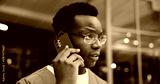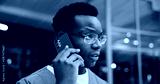 Night, phone call and black man in hospital, conversation and schedule with emergency room. Evening, medical service or African person in clinic, cellphone or contact with late shift, bokeh or health