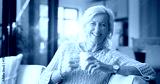 Happy, coffee and portrait of senior woman on sofa in home with relax in retirement in living room. Smile, tea and elderly female person drinking warm beverage in morning with rest, calm or peace.