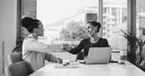 Handshake, meeting and business women for partnership, deal or thank you in office. B2B merger, laptop or shaking hands for welcome, congratulations or client introduction for collaboration agreement