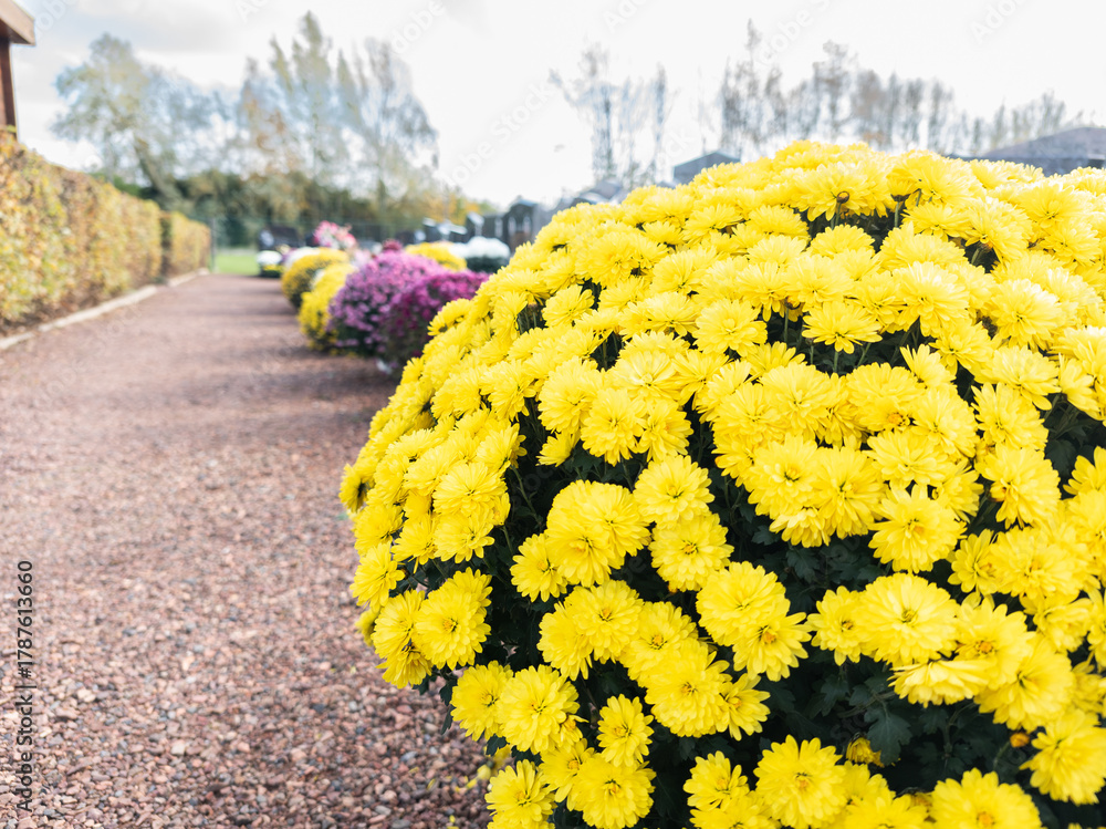 Colorful chrysanthemums flowers on graveyard in front of a tombstone during all saints day and all souls day, to commemorate loved ones that passed away. Flowers on cemetery. All saints day graveyard.