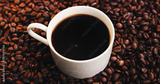 Coffee production, roast and cup with beans for caffeine, espresso beverage or cappuccino blend. Background, cafeteria and closeup of drink in mug for latte, granules or organic grain for hospitality