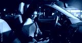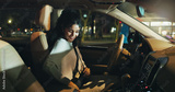 Business, night and seatbelt with woman in car on city street for safe commute to destination. Drive, security and transportation with happy employee in vehicle for ride in dark urban location