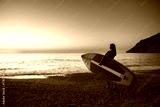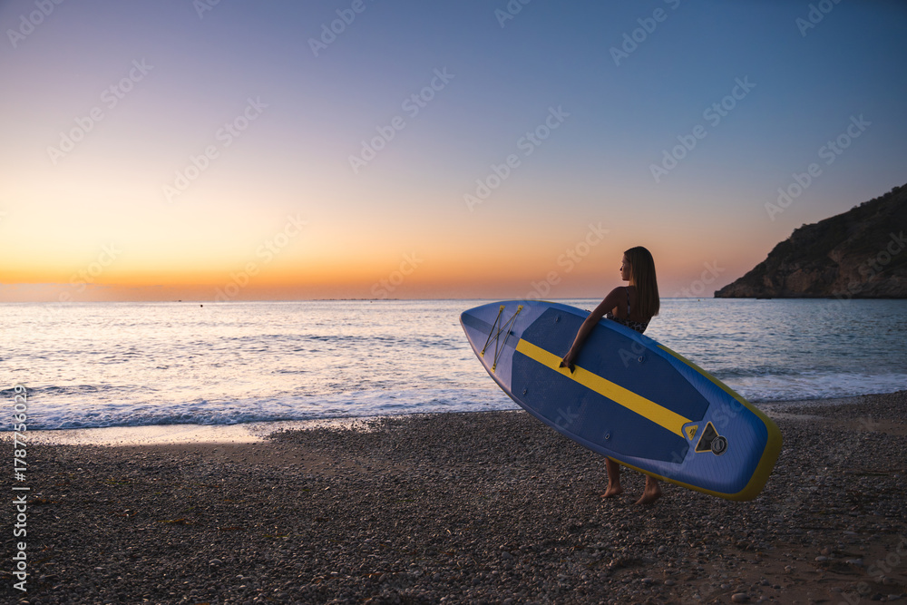 Contemplative woman carrying paddleboard at ocean beach during sunset