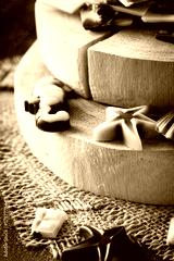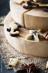 Various raw chocolate candies on wooden board, dark background. Healthy sweets