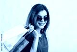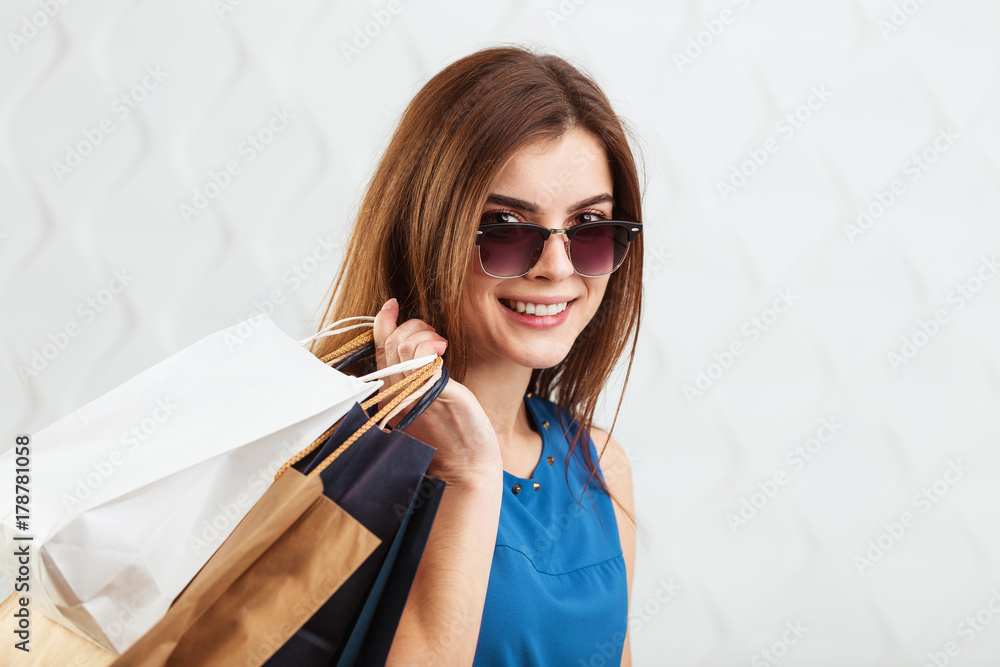 Young cheerful girl wears blue scirt and sunglasses holding shopping colorful bags on white isolated background, shopaholic concept